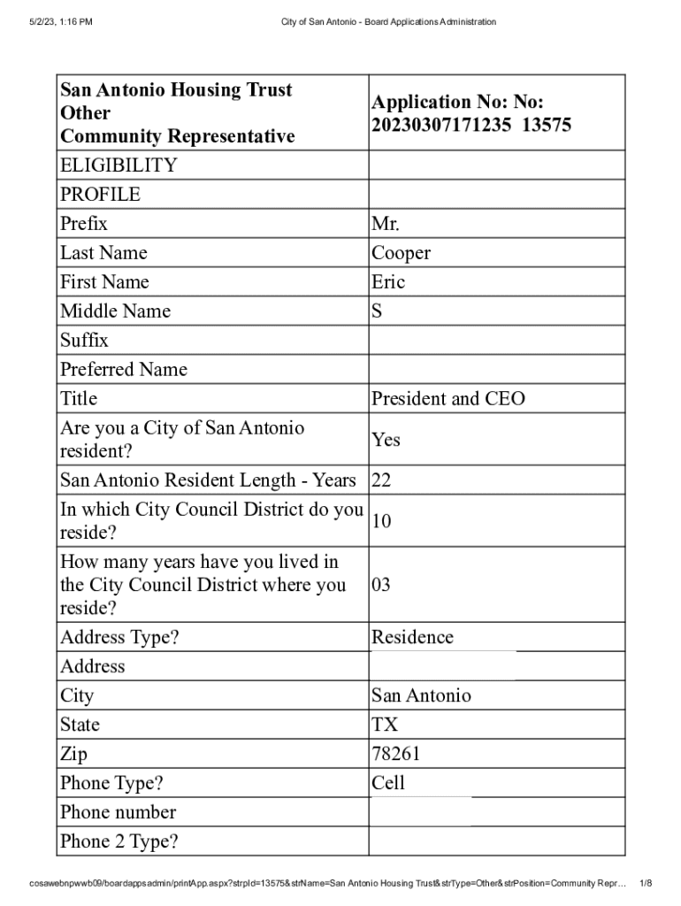 5/2/23, 1:16 City of San Antonio Board Applications Administration San Antonio Housing Trust Other Community Representative ELIGIBILITY PROFILE Prefix Last Name First Name Middle Name Suffix Preferred