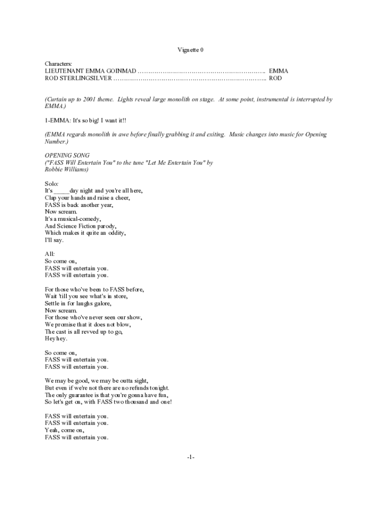 (Curtain up to 2001 theme. Lights reveal large monolith on stage. At some point, instrumental is interrupted by