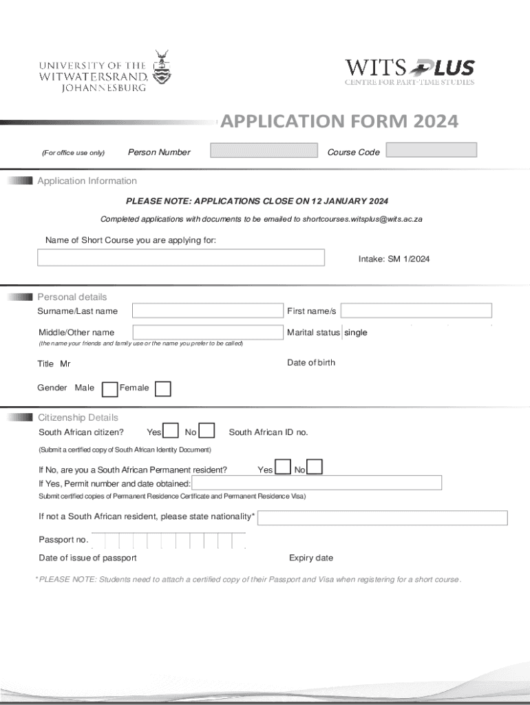 APPLICATION FORM 2024 (For OFCE use only)Person Outercourse Reapplication Information PLEASE NOTE: APPLICATIONS CLOSE ON 12 JANUARY 2024 Completed applications with documents to be emailed to shortcourses.witsplus@wits.ac.zaName