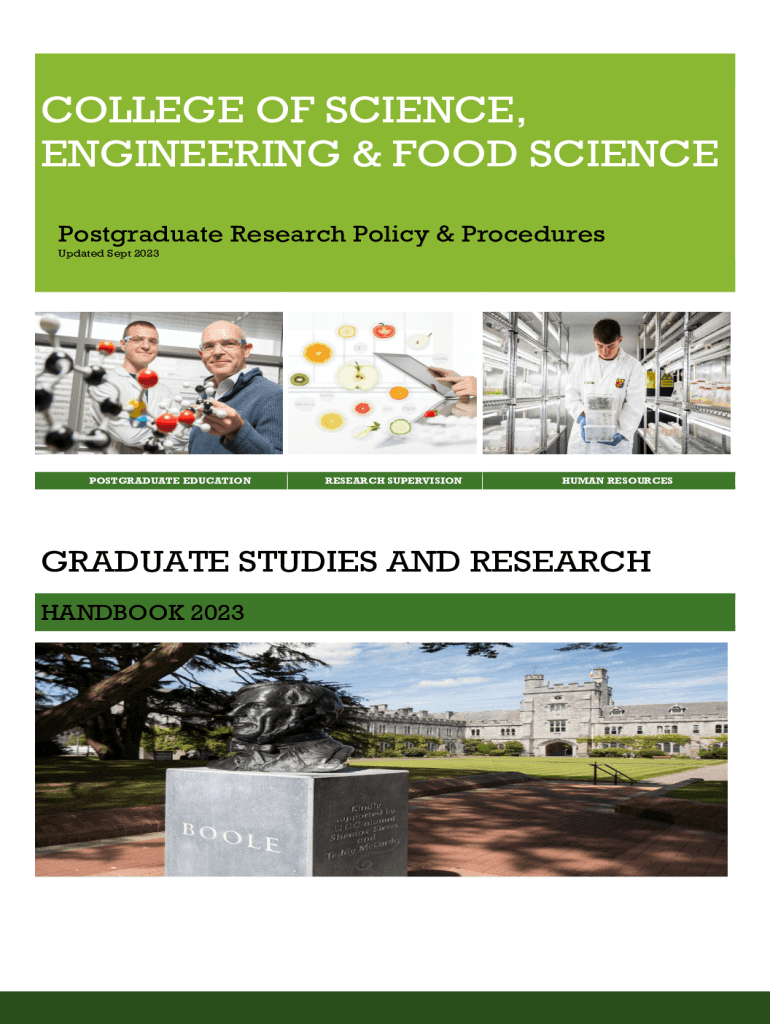 COLLEGE OF SCIENCE, ENGINEERING & FOOD SCIENCE Postgraduate Research Policy & Procedures Updated Sept 2023POSTGRADUATE EDUCATIONRESEARCH SUPERVISIONHUMAN RESOURCESGRADUATE STUDIES AND RESEARCH HANDBOOK