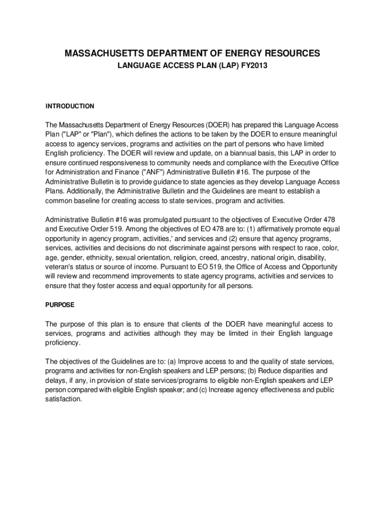 MASSACHUSETTS DEPARTMENT OF ENERGY RESOURCES LANGUAGE ACCESS PLAN (LAP) FY2013INTRODUCTIONThe Massachusetts Department of Energy Resources (DOER) has prepared this Language Access Plan (\” LAP\”