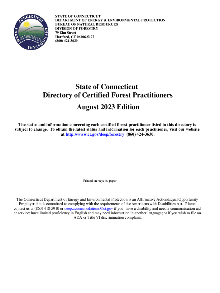 STATE OF CONNECTICUT DEPARTMENT OF ENERGY & ENVIRONMENTAL PROTECTION BUREAU OF NATURAL RESOURCES DIVISION OF FORESTRY 79 Elm Street Hartford, CT 061065127 (860) 4243630State of Connecticut Directory