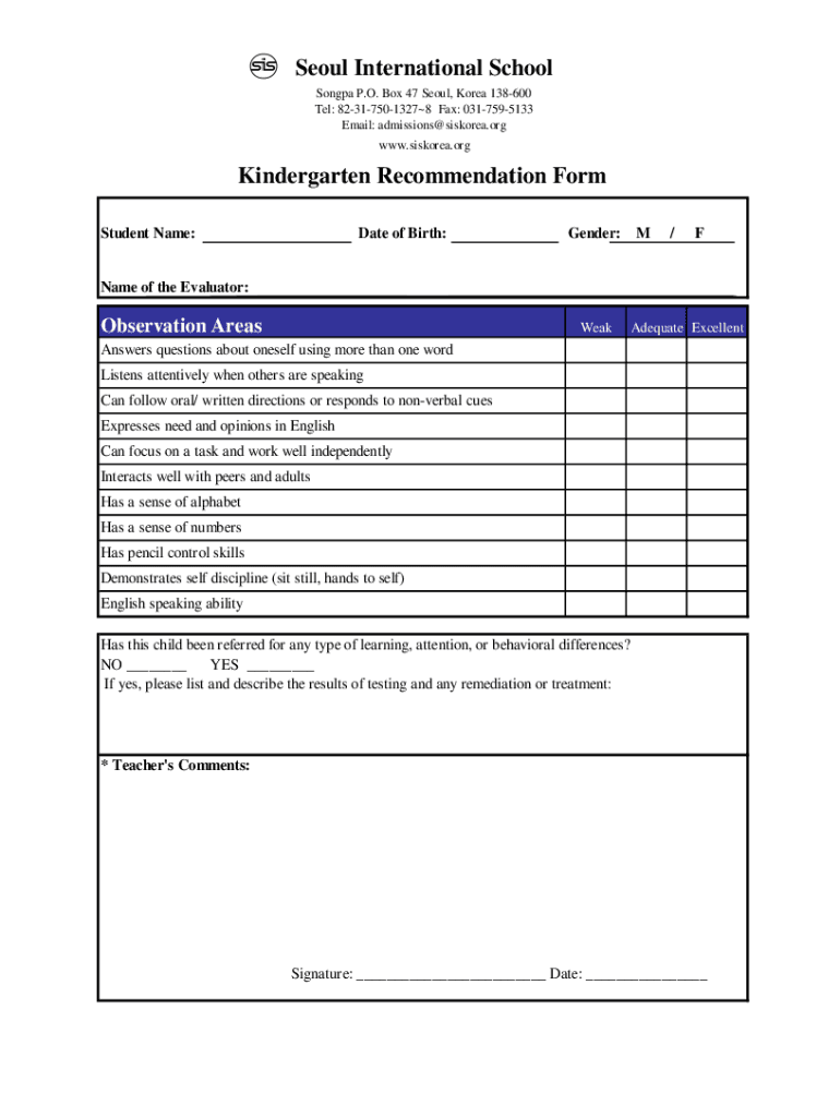 Seoul International School Song pa P.O. Box 47 Seoul, Korea 138600 Tel: 823175013278 Fax: 0317595133 Email: admissions@siskorea.org www.siskorea.orgKindergarten Recommendation Form Student Name:Date