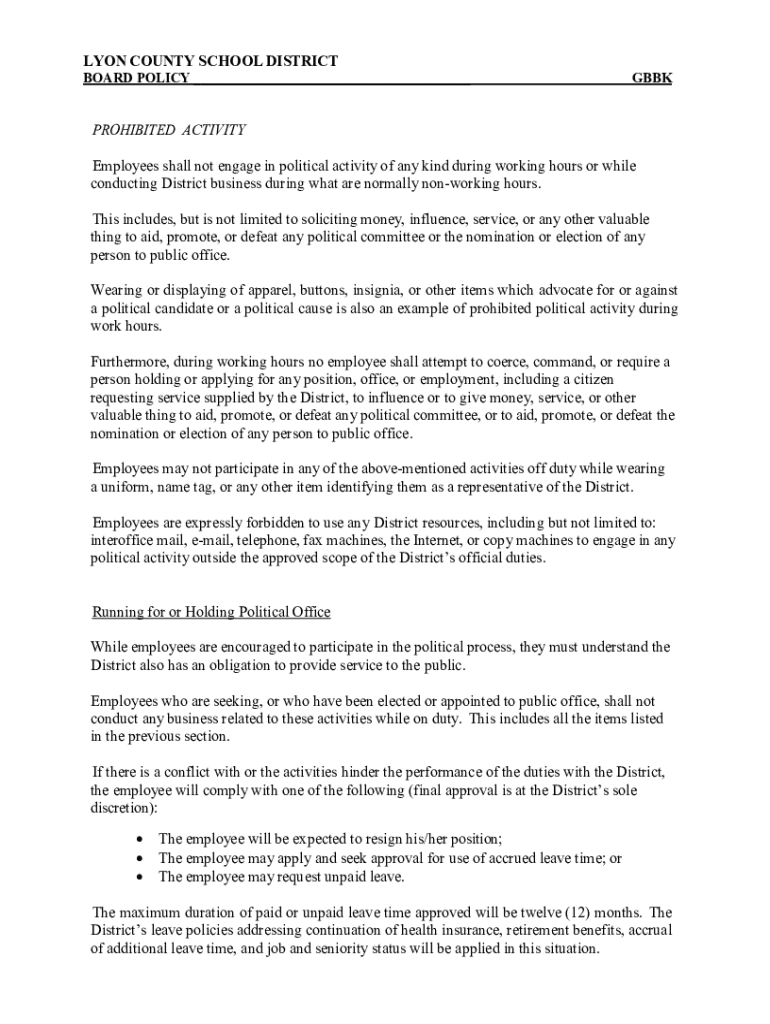 LYON COUNTY SCHOOL DISTRICTBOARD POLICY ___GBBKPROHIBITED ACTIVITY Employees shall not engage in political activity of any kind during working hours or while conducting District business during what