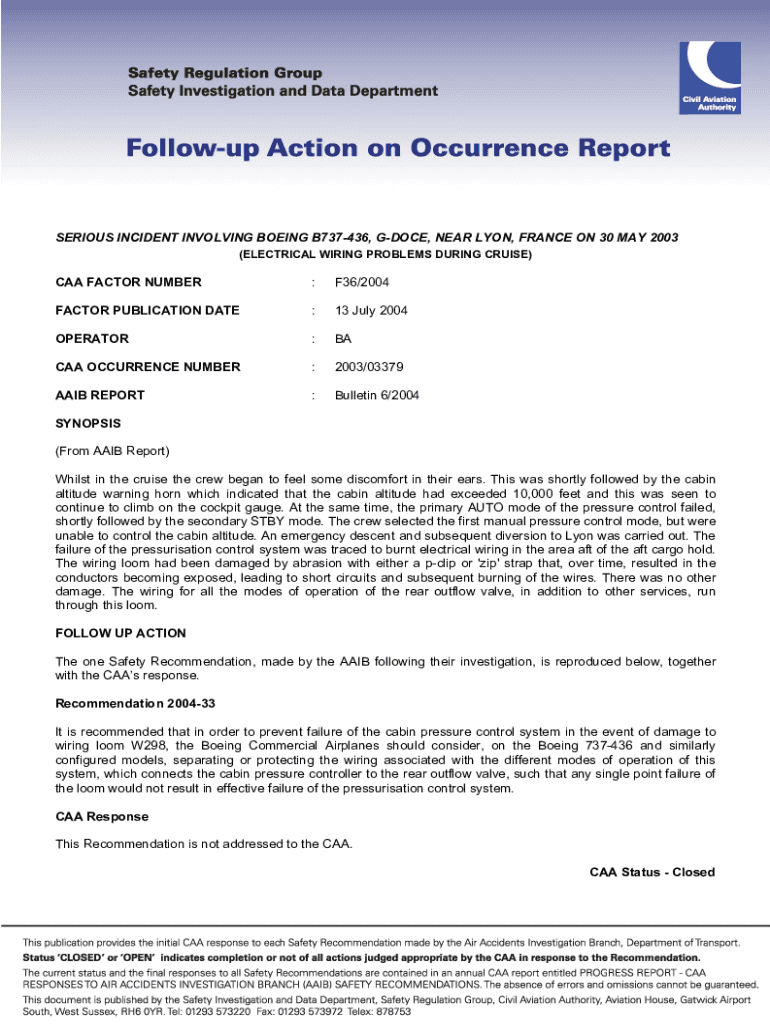 Followup Action on Occurrence ReportSERIOUS INCIDENT INVOLVING BOEING B737436, DONE, NEAR LYON, FRANCE ON 30 MAY 2003