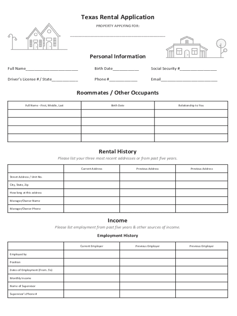 Texas Rental Application PROPERTY APPLYING FOR: ___Personal Information Full Name___Birth Date___Social Security #___Driver's License # / State___Phone #___Email___Roommates / Other Occupants Full