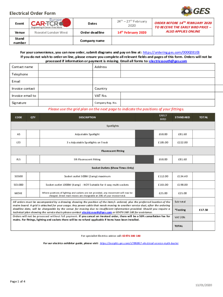 Electrical Order Form Event VenueNovotel London Washstand numberDates24th 27th February 2020Order deadline14th February 2020ORDER BEFORE 14TH FEBRUARY 2020 TO RECEIVE THE EARLY BIRD PRICE ALSO APPLIES
