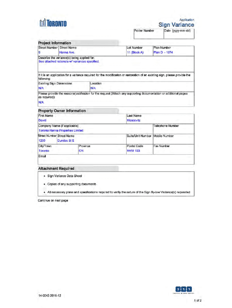 ApplicationltJillTORONIOSign Variance Folder NumberProject Informational (yyyymmdd)\” 1Street Number I Street Name 9 Hanna Ave. Lot Number 11 (Block A)Plan Number Plan D 1974Describe the variance(s)