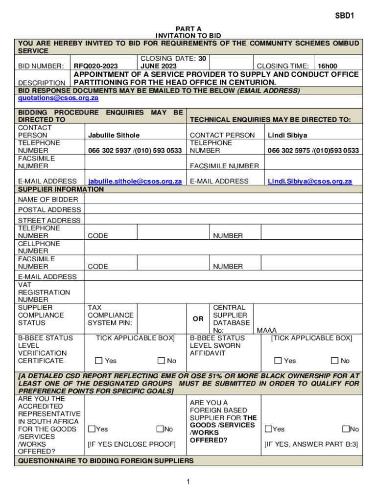 SBD1 PART A INVITATION TO BID YOU ARE HEREBY INVITED TO BID FOR REQUIREMENTS OF THE COMMUNITY SCHEMES OM BUD SERVICE CLOSING DATE: 30 BID NUMBER: RFQ0202023 JUNE 2023 CLOSING TIME: 16h00APPOINTMENT