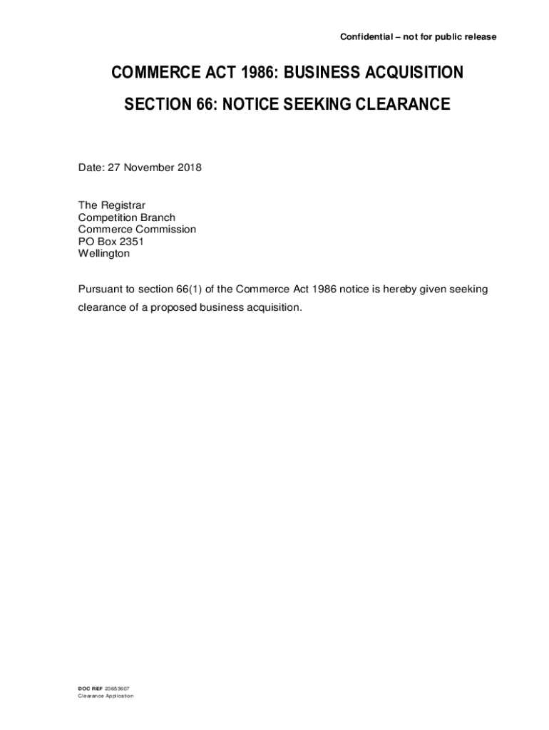 Confidential not for public releaseCOMMERCE ACT 1986: BUSINESS ACQUISITION SECTION 66: NOTICE SEEKING CLEARANCEDate: 27 November 2018The Registrar Competition Branch Commerce Commission PO Box 2351
