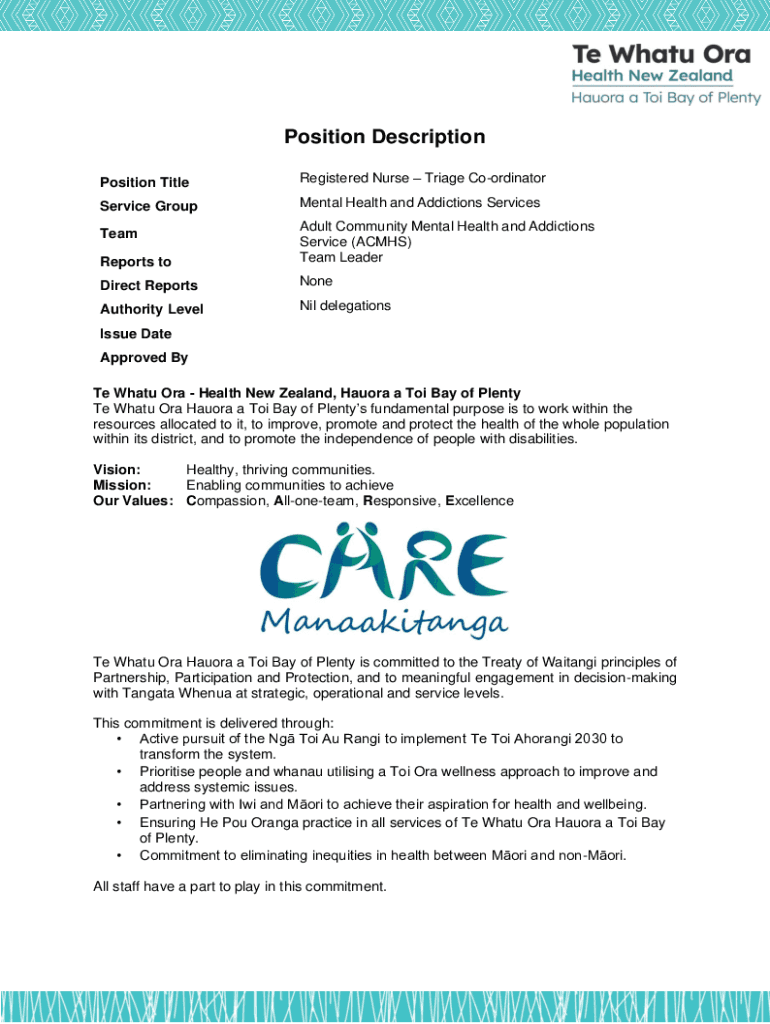 Position Description Position TitleRegistered Nurse Triage CoordinatorService GroupMental Health and Addictions ServicesReports adult Community Mental Health and Addictions Service (ACMES) Team LeaderDirect
