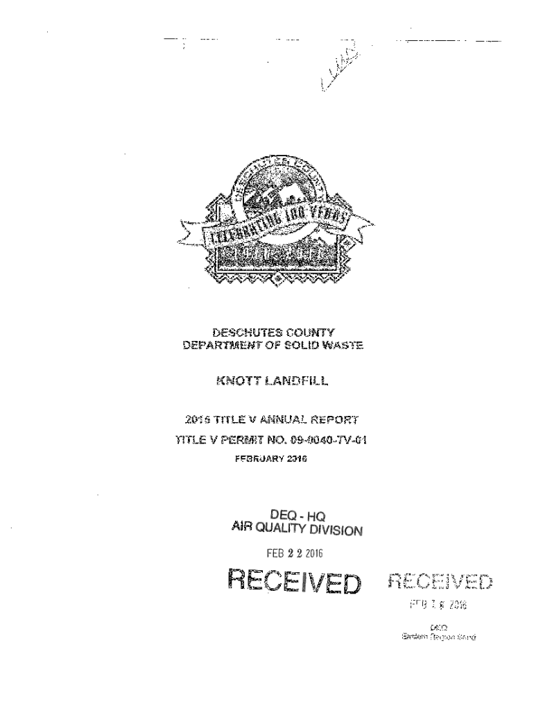 DELHI QUALITY DIVISION FEB 2 2 2016IKnott Landfill Permit No. 090040TV01 Title V Annual Report Reporting Year: 2015 Report ContentsReport Conditioner/AttachmentDetail38.title V Answer Sheet Annual
