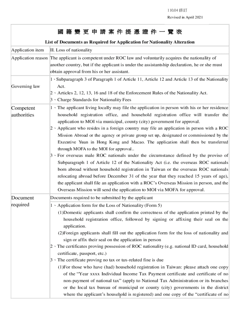 List of Documents as Required for Application for Nationality Alteration