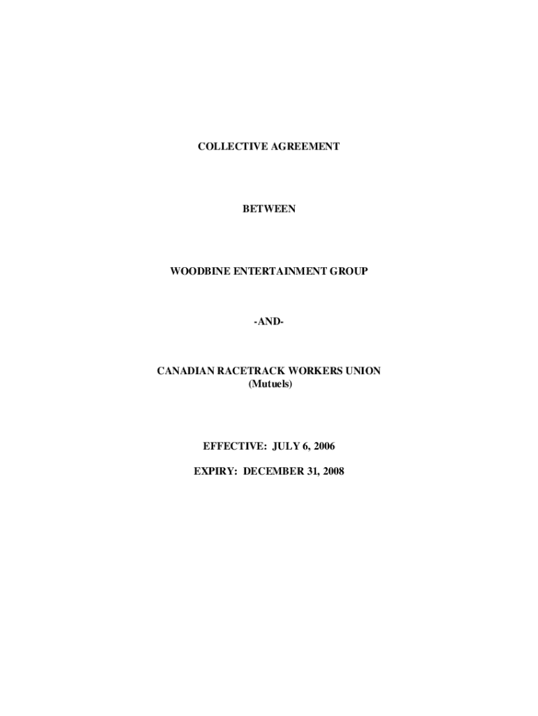 COLLECTIVE AGREEMENTBETWEENWOODBINE ENTERTAINMENT GROUPANDCANADIAN RACETRACK WORKERS UNION (Mutual)EFFECTIVE: JULY 6, 2006, EXPIRY: DECEMBER 31, 2008THIS AGREEMENT dated as of the day of, 2006. B