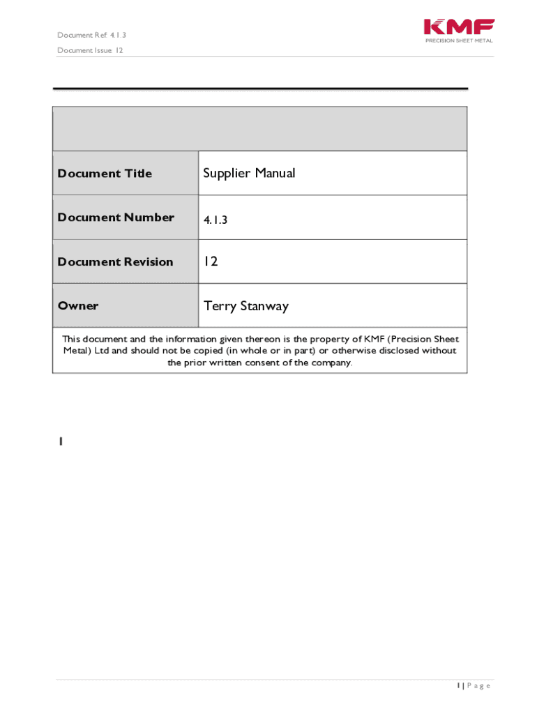 Document Ref: 4.1.3 Document Issue: 12Document TitleSupplier ManualDocument Number4.1.3Document Revision12OwnerTerry StanwayThis document and the information given thereon is the property of KMF (Precision