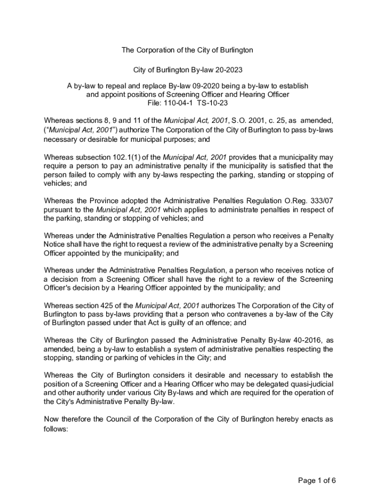 The Corporation of the City of Burlington City of Burlington Bylaw 202023 A bylaw to repeal and replace Bylaw 092020 being a bylaw to establish and appoint positions of Screening Officer and Hearing