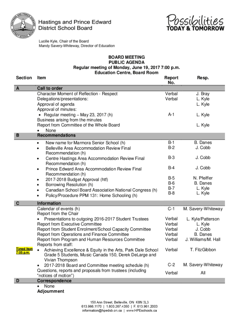 BOARD MEETING PUBLIC AGENDA Regular meeting of Monday, June 19, 2017 7:00 p.m. Education Center, Board Room Report No. SectionItemACall to order Character Moment of Reflection Respect Delegations/presentations:
