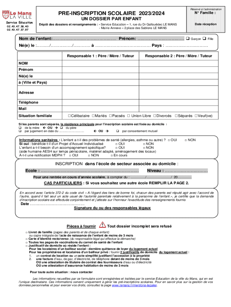 Serve ladministrationPREINSCRIPTION CLAIRE 2023/2024 N Camille :UN DOSSIER PAR ENFANTService Educational receptionist DES dossier set restatements : Service Education 1, rue Du Dr Gallaudet LE MANS