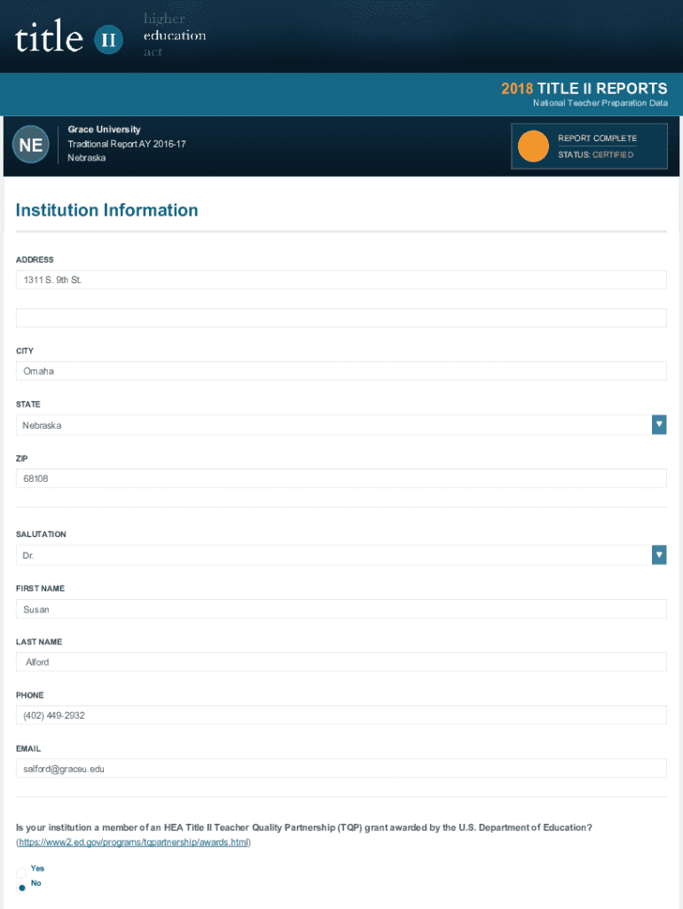 ADDRESS1311S.9thSt.CITYOmahaSTATENebraskaZIP68108SALUTATIONDr.FIRSTNAMESusanLASTNAMEAlfordPHONE(402)4492932EMAILsalford@graceu.eduIsyourinstitutionamemberofanHEATitleIITeacherQualityPartnership(TOP)grantawardedbytheU.S