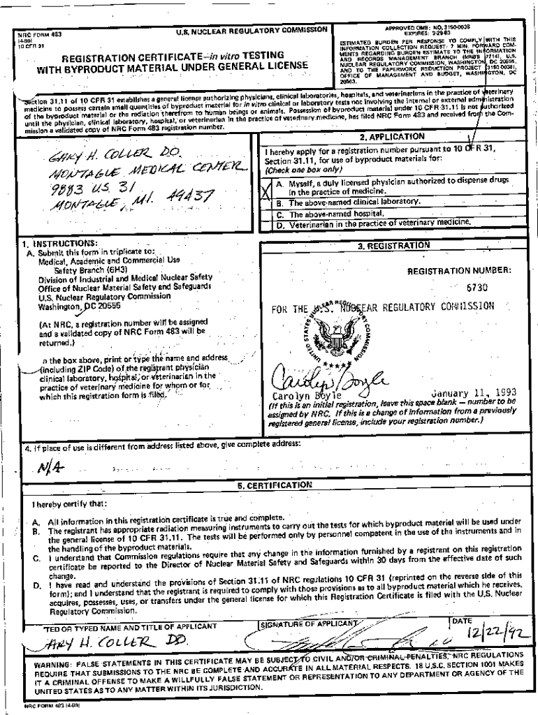 FORM 483 (490 10 CFI I 31NRCA \'Rev!.11 A .... U.b. r4ULLr.#in rituals.rnRMMiqIflN1,I REGISTRATION CERTIFICATE in Vito TESTING WITH BYPRODUCT MATERIAL UNDER GENERAL LICENSEIAPPROVED 0 MB: NO. 31500038APPROVED