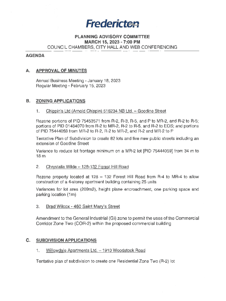 Fredericton PLANNING ADVISORY COMMITTEE MARCH 15, 2023 7:00 PM COUNCIL CHAMBERS, CITY HALL AND WEB CONFERENCING AGENDA A.APPROVAL OF MINUTES Annual Business Meeting January 18, 2023, Regular Meeting