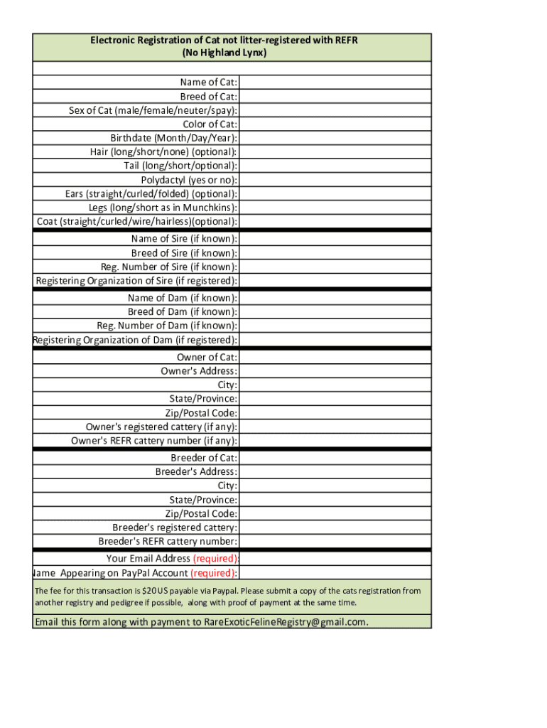 Electronic Registration of Cat not litter registered with REAR (No Highland Lynx) Name of Cat: Breed of Cat: Sex of Cat (male/female/neuter/spay): Color of Cat: Birthdate (Month/Day/Year): Hair (long/short/none)