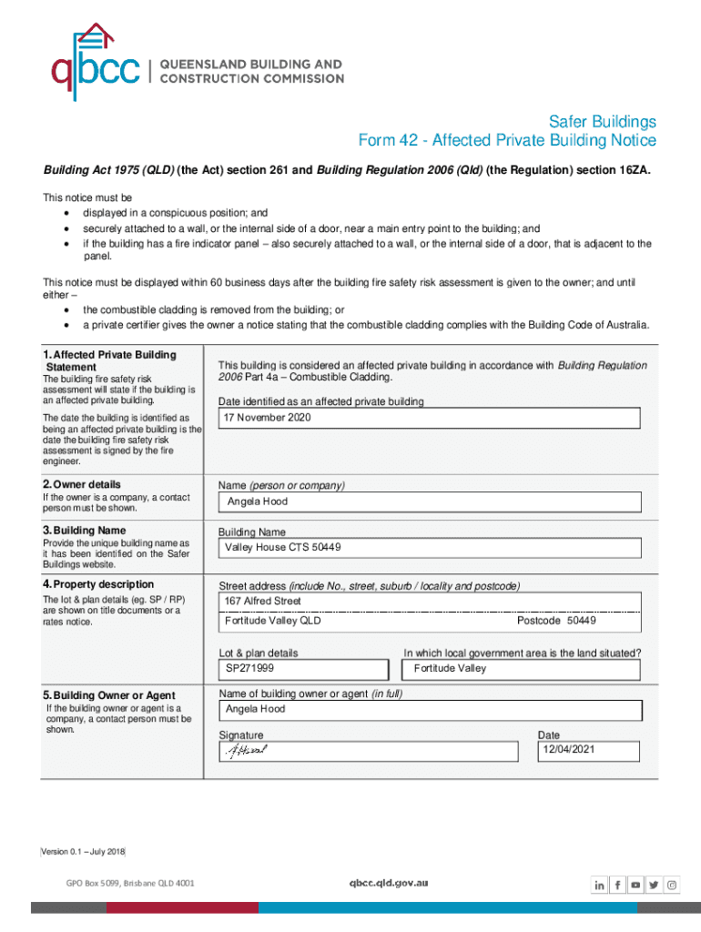 Safer Buildings Form 42 Affected Private Building Notice Building Act 1975 (QLD) (the Act) section 261 and Building Regulation 2006 (QLD) (the Regulation) section 16ZA. This notice must be displayed