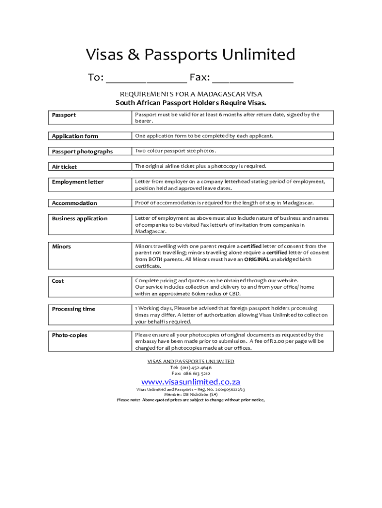 Visas & Passports Unlimited To: ___ Fax: ___ REQUIREMENTS FOR A MADAGASCAR VISA South African Passport Holders Require Visas. PassportPassport must be valid for at least 6 months after return date,