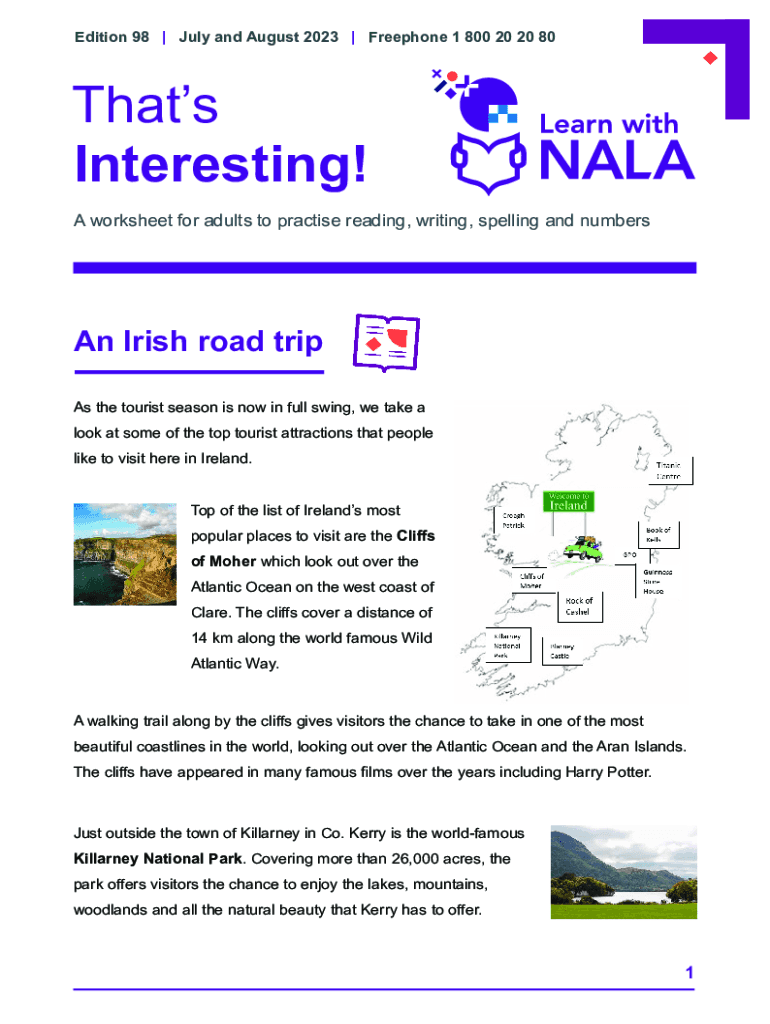Edition 98 | July and August 2023 | Freephone 1 800 20 20 80Thats Interesting! A worksheet for adults to practice reading, writing, spelling and numbers Irish road trip As the tourist season is now