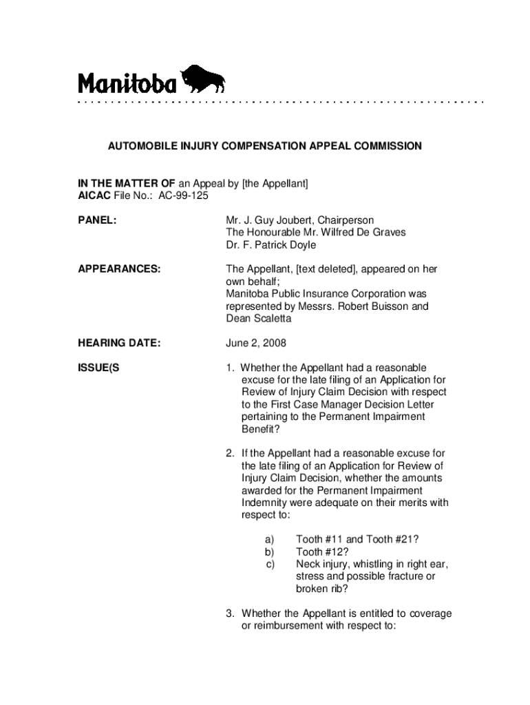 AUTOMOBILE INJURY COMPENSATION APPEAL COMMISSIONING THE MATTER OF an Appeal by [the Appellant] AI CAC File No.: AC99125 PANEL:Mr. J. Guy Joubert, Chairperson The Honorable Mr. Wilfred De Graves Dr.
