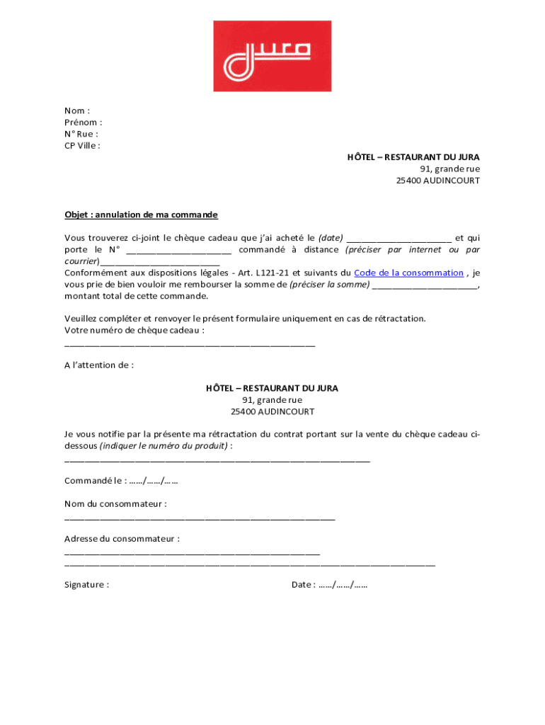 Not : Prom : N Rue : CP Villa : HOTEL RESTAURANT DU JURY 91, Grande rue 25400 AUDINCOURTObjet : annulation DE my command Vows trouvère joint LE chose Nadeau Que JAI aches LE (date) ___ ET quit port