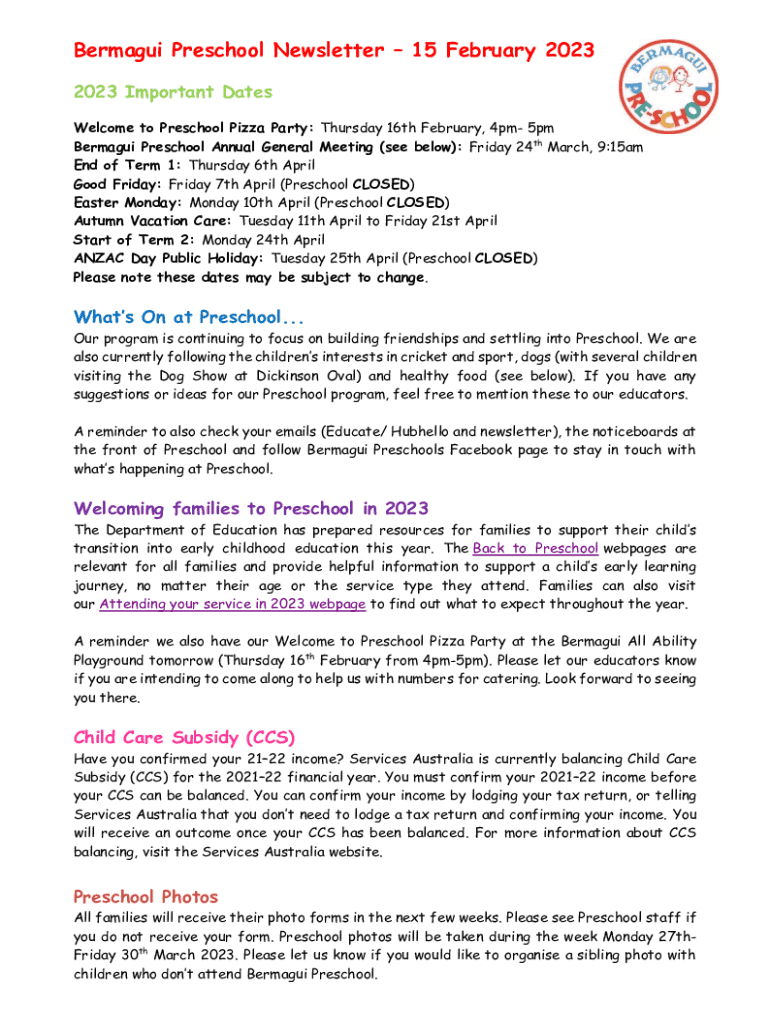Berman Preschool Newsletter 15 February 2023 2023 Important Dates Welcome to Preschool Pizza Party: Thursday 16th February, 4pm 5pm Berman Preschool Annual General Meeting (see below): Friday 24th