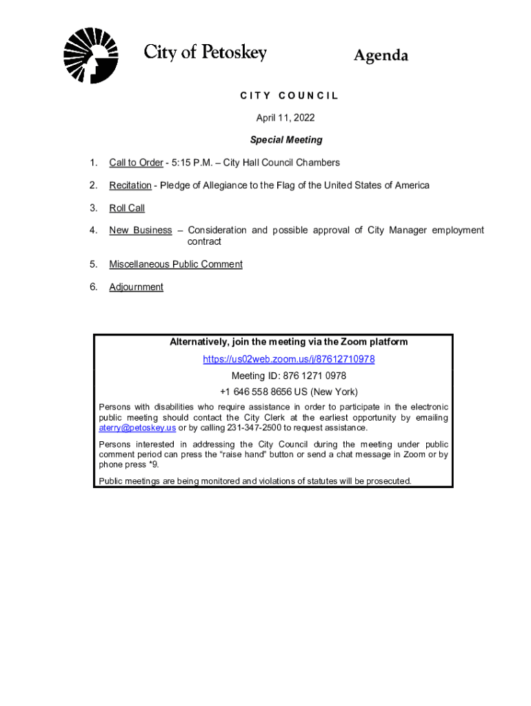 Agenda CITY COUNCIL April 11, 2022, Special Meeting 1. Call to Order 5:15 P.M. City Hall Council Chambers2. Recitation Pledge of Allegiance to the Flag of the United States of America3. Roll Call4.