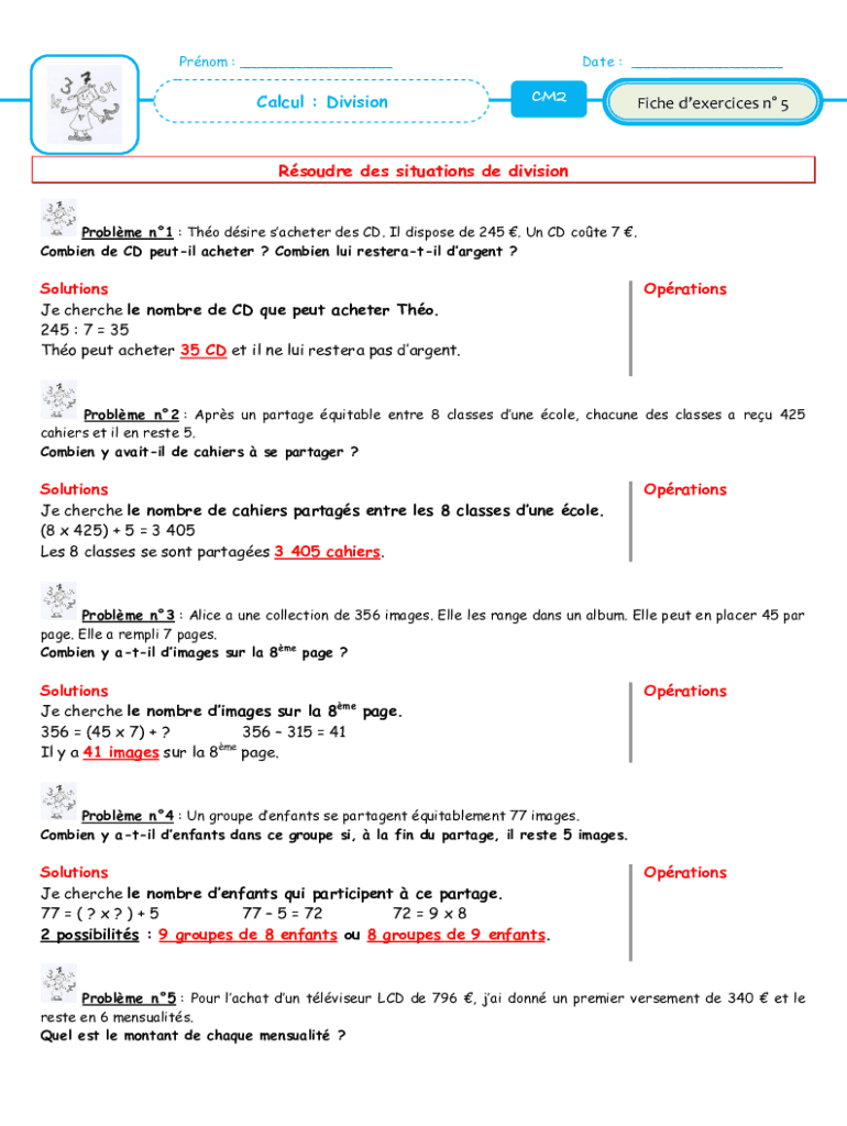 Prom : ___Calculi : Divisional : ___CM2Fiche exercises n 5Rsoudre DES situations de divisionProblme n1 : Tho desire sachet her DES CD. IL dispose DE 245. Un CD cote 7. Combine de CD pupil Chester