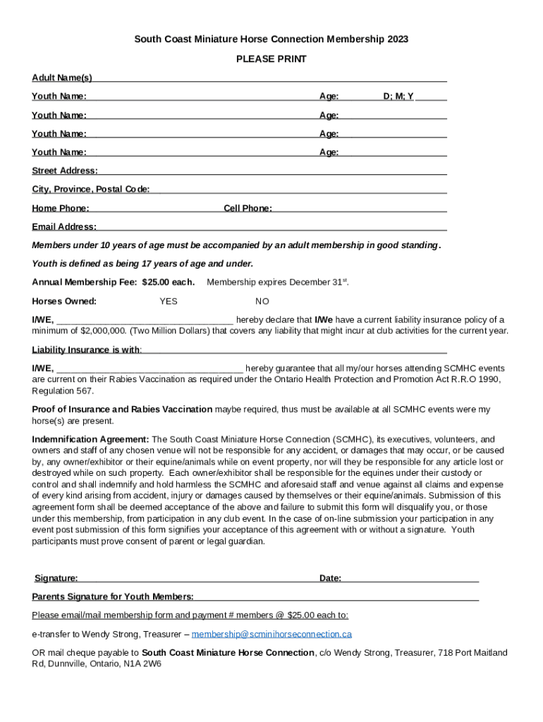 South Coast Miniature Horse Connection Membership 2023 PLEASE PRINT Adult Name(s) Youth Name:Age:Youth Name:Age:Youth Name:Age:Youth Name:Age'd; M; Street Address: City, Province, Postal Code: Home
