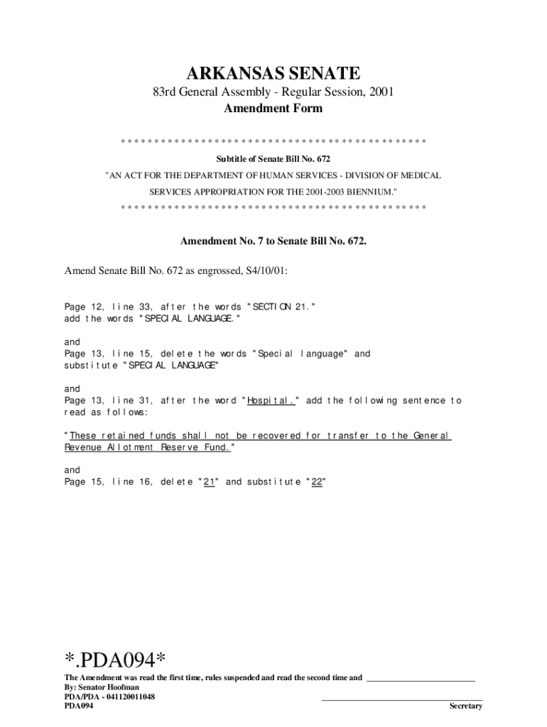 ARKANSAS SENATE 83rd General Assembly Regular Session, 2001 Amendment Form ********************************************** Subtitle of Senate Bill No. 672 \” AN ACT FOR THE DEPARTMENT OF HUMAN SERVICES