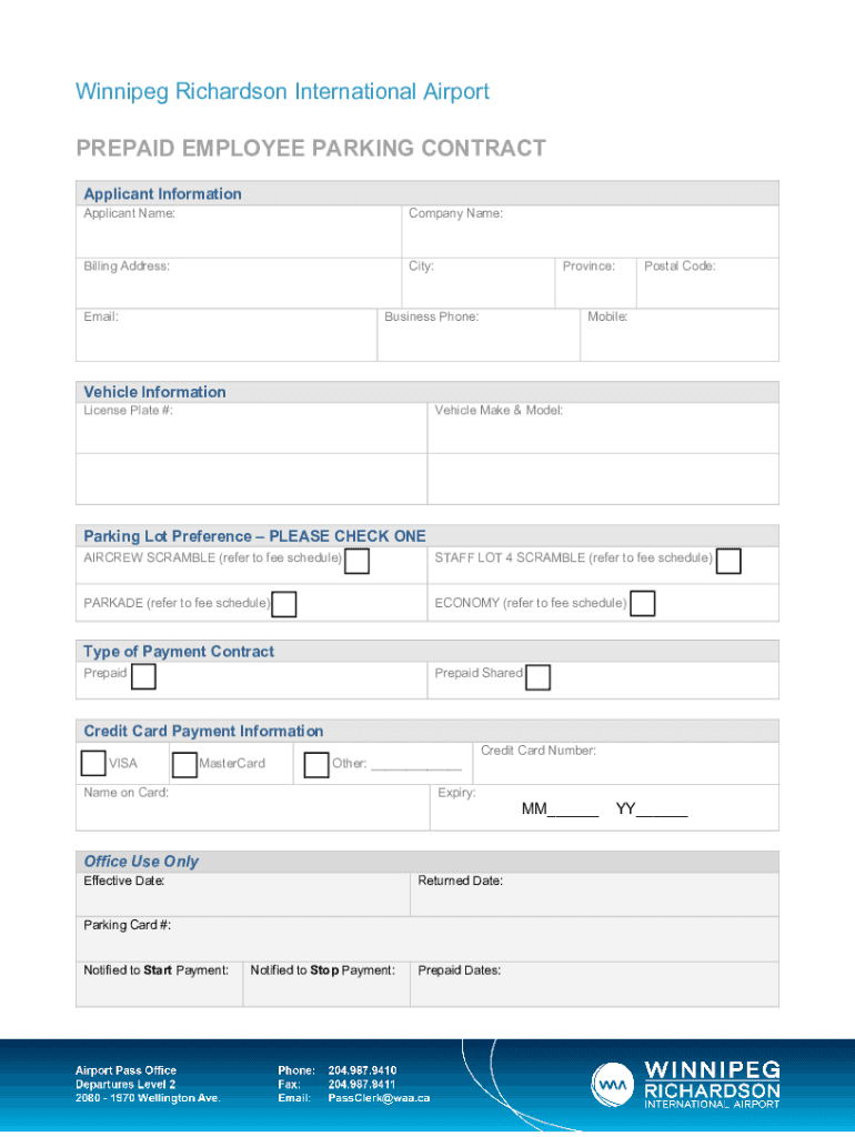 Winnipeg Richardson International Airport PREPAID EMPLOYEE PARKING CONTRACT Applicant Information Applicant Name:Company Name:Billing Address:City:Email:Province:Business Phone:Postal Code:Mobile:Vehicle