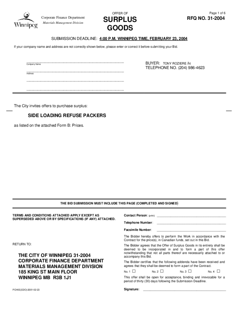 Page 1 of 6OFFER Corporate Finance Department Materials Management Division NO. 312004SURPLUS GOODSSUBMISSION DEADLINE: 4:00 P.M. WINNIPEG TIME, FEBRUARY 23, 2004, If your company name and address