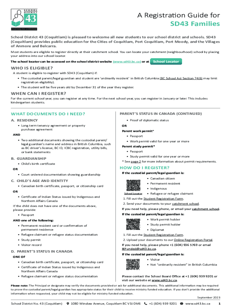 A Registration Guide for SD43 Families School District 43 (Coquitlam) is pleased to welcome all new students to our school district and schools. SD43 (Coquitlam) provides public education for the
