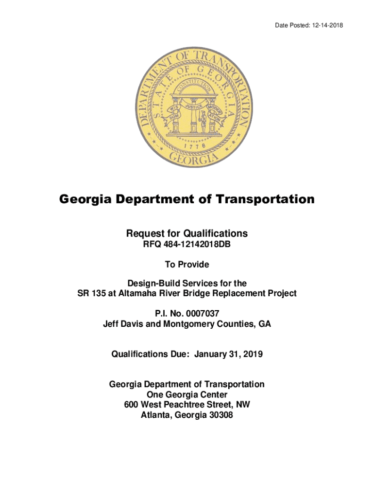 Date Posted: 12142018Georgia Department of Transportation Request for Qualifications RFQ 48412142018DB To Provide DesignBuild Services for the SR 135 at Altamaha River Bridge Replacement Project P.I.