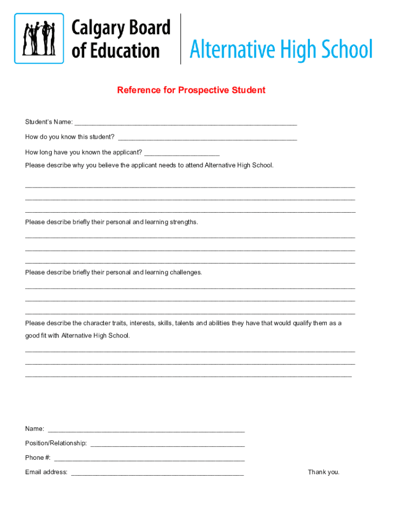 Reference for Prospective Student Students Name: ___ How do you know this student? ___ How long have you known the applicant? ___ Please describe why you believe the applicant needs to attend Alternative