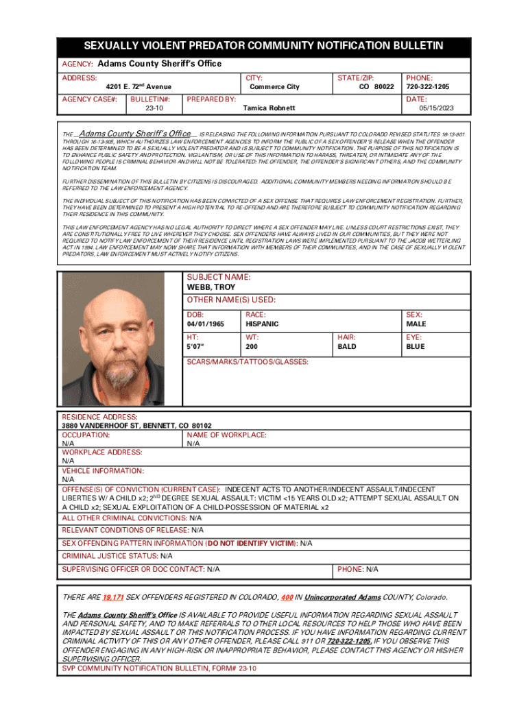 SEXUALLY VIOLENT PREDATOR COMMUNITY NOTIFICATION BULLETIN AGENCY:Adams County Sheriffs OfficeADDRESS:CITY: Commerce City4201 E. 72nd Avenue AGENCY CASE#:BULLETIN#: 2310STATE/ZIP: CO 80022PREPARED