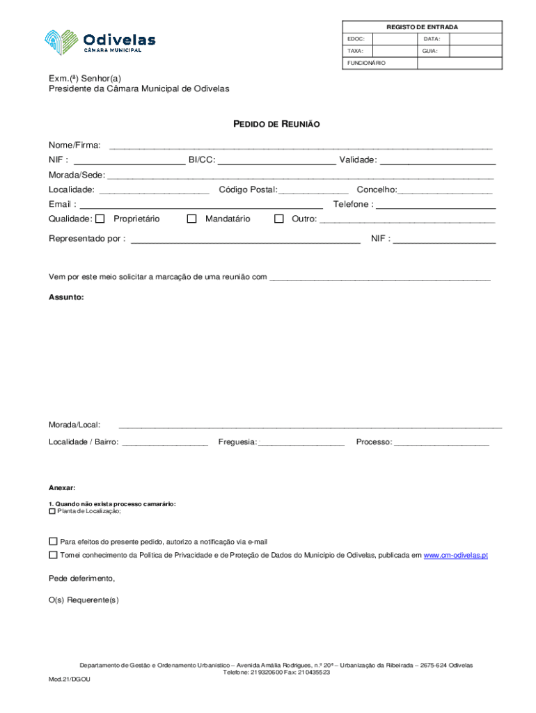 REGISTER DE ESTRADA DOC:DATA:TAXA:GUI:FUNCIONRIOExm.() Senior(a) President the Clara Municipal de OdivelasPEDIDO DE REUNION Nome/Firm: ___ NIF :BI/CC:Validate:Moreira/See: ___ Localized: ___Cargo