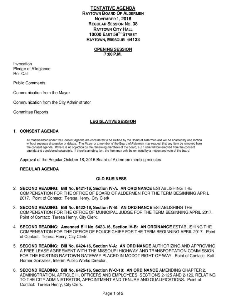 TENTATIVE AGENDA BAYTOWN BOARD OF ALDERMEN NOVEMBER 1, 2016, REGULAR SESSION NO. 38 BAYTOWN CITY HALL 10000 EAST 59TH STREET BAYTOWN, MISSOURI 64133 OPENING SESSION 7:00 P.M. Invocation Pledge of