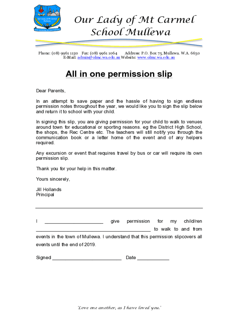 Our Lady of Mt Carmel School Muller Phone: (08) 9961 1120 Fax: (08) 9961 1064 Address: P.O. Box 75, Muller. W.A. 6630 Email: admin@olmc.wa.edu.au Website: www.olmc.wa.edu.auAll in one permission slip