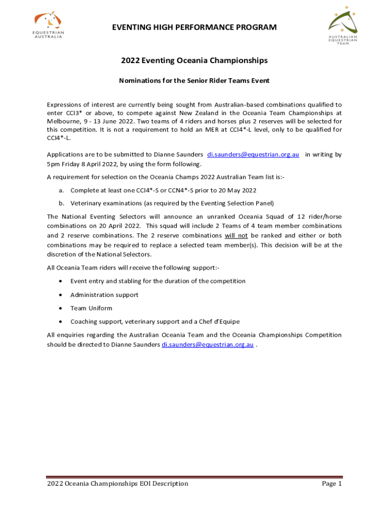 EVENTING HIGH PERFORMANCE PROGRAM2022 Eventing Oceania Championships Nominations for the Senior Rider Teams Event Expressions of interest are currently being sought from Australian based combinations