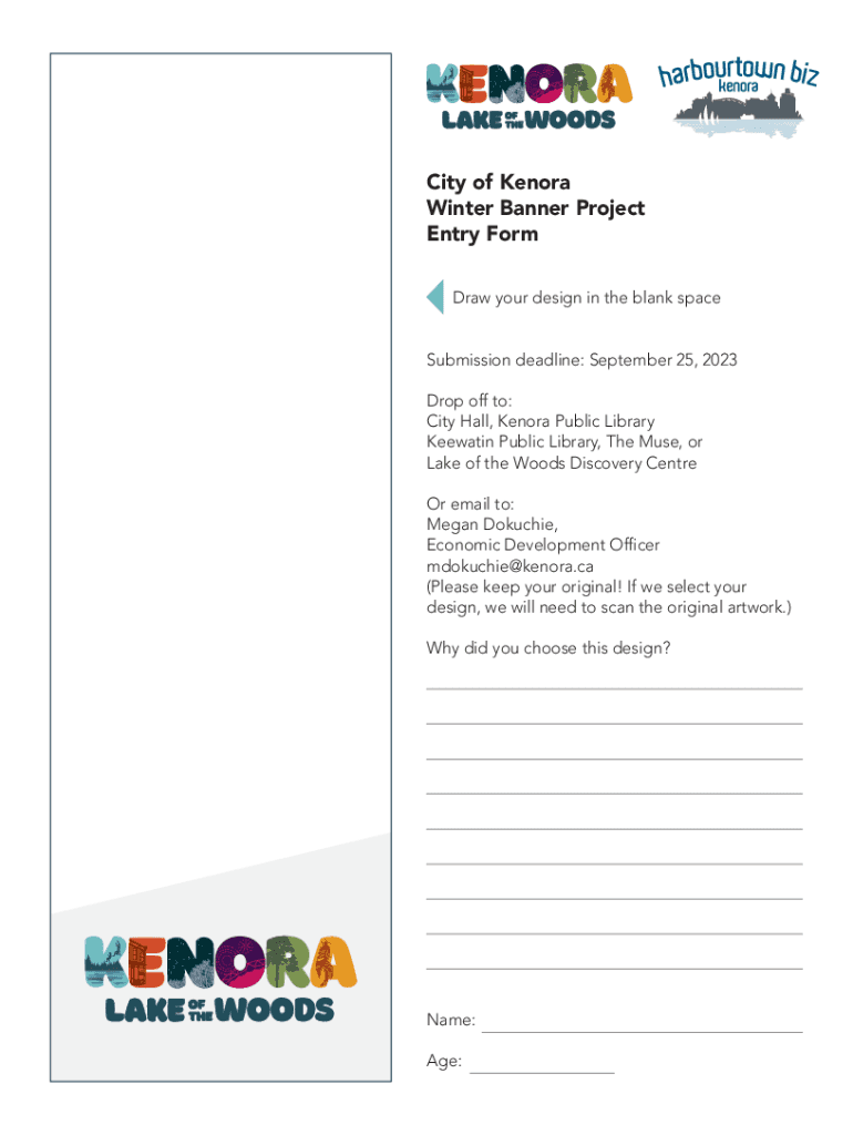 City of Kendra Winter Banner Project Entry Form Draw your design in the blank space Submission deadline: September 25, 2023, Drop off to: City Hall, Kendra Public Library Keewatin Public Library,