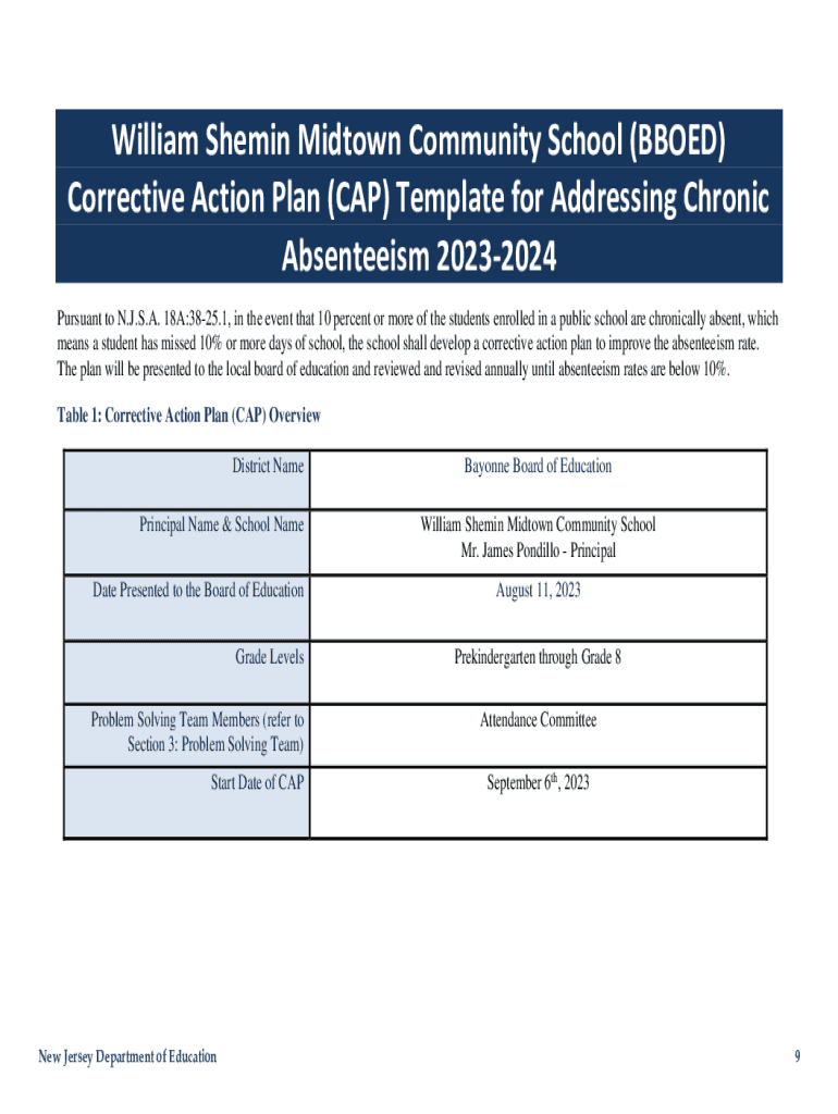William She is min Midtown Community School (BOOED) Corrective Action Plan (CAP) Template for Addressing Chronic Absenteeism 20232024 Pursuant to N.J.S.A. 18A:3825.1, in the event that 10 percent