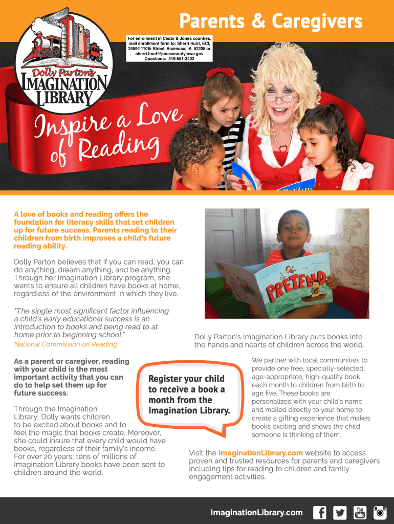 For enrollment in Cedar & Jones counties, mail enrollment form to: Sherri Hunt, PCI, 24594 110th Street, Samosa, IA 52205 or sherri.hunt@jonescountyiowa.gov Questions: 3195513402DOLLY PARSONS IMAGINATION