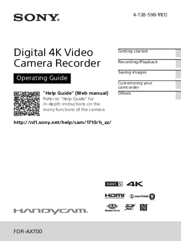 472859811(1)Digital 4K Video Camera RecorderGetting started Recording/Playback Saving imagesOperating Guide Help Guide (Web manual) Refer to Help Guide for in depth instructions on the many functions